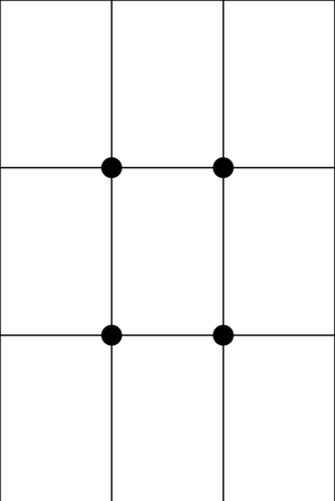 Esta guía reparte la imagen en 9 rectángulos iguales, básicamente cruzando dos líneas verticales con dos horizontales. Con esta división se crean 4 puntos de interés que serán los que deberás recordar a la hora de crear tus composiciones.